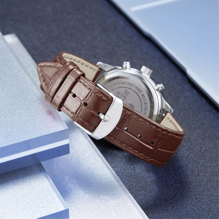 Fabricada con cuero vacuno de primera calidad con proceso de impermeabilización, esta correa es transpirable y suave. La fina mano de obra y el diseño de textura de cocodrilo le dan un aspecto elegante y de alta gama. La hebilla de acero inoxidable es libre de níquel, segura para pieles sensibles.