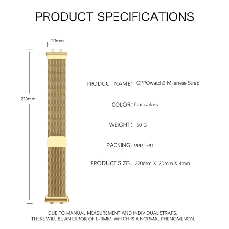 ¿Estás buscando una forma de renovar tu reloj inteligente? La correa de repuesto para el reloj inteligente Oppo Watch 3 es la elección perfecta. Fabricada con un material metálico de alta calidad, esta correa no solo es exquisita, sino también más duradera, lo que garantiza que tu accesorio se mantenga en excelente estado a lo largo del tiempo. Su diseño de hebilla magnética permite un ajuste fácil y cómodo, adaptándose perfectamente a diferentes tamaños de muñeca. Con una longitud de 220 mm y adecuada para circunferencias de muñeca de 160 a 220 mm, ofrece una gran versatilidad. Además, su diseño de malla fina permite que la piel respire, evitando la acumulación de sudor, lo que la convierte en una opción ideal para el uso diario. Si tu antigua correa está rota o desgastada, esta es la opción ideal para revitalizar tu reloj inteligente y darle un toque de elegancia moderna.